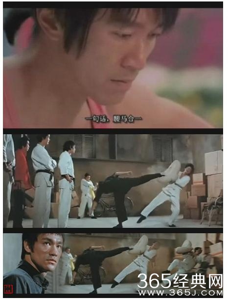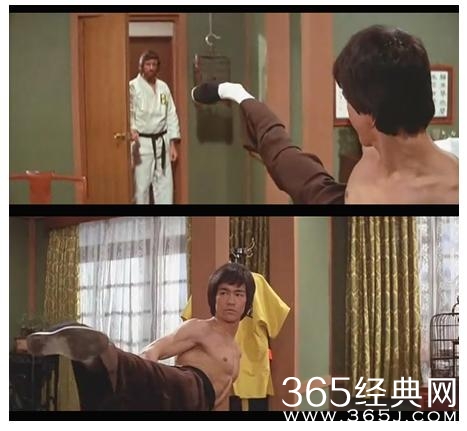 然后李小龙在电影《猛龙过江》中展示了一个威力惊人的飞身侧踢动作!