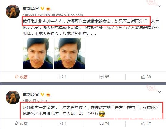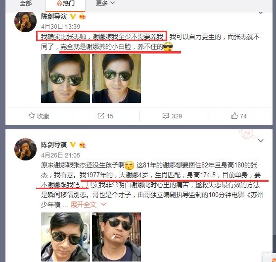 如今再看,或许人们热议的话题不再是王宝强离婚案,也不是马蓉和宋喆,或许都认为陈剑会消停一会儿了吧?错,大错特错,简直是狗改不了吃屎。陈剑最近又盯上了谢娜和张杰夫妇。我们先来看几张微博截图:
