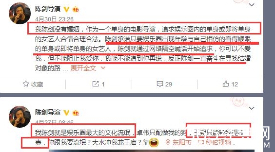这哥们还自信满满,声称自己没有婚姻而且单身,有权利追求任何一位女艺人,并扬言自己只要看上哪位年龄相仿、气质相投、看得顺眼的女艺人,都会通过网络隔空求爱。卧槽,真的有点像疯狗一样吓人,逮着谁咬谁。