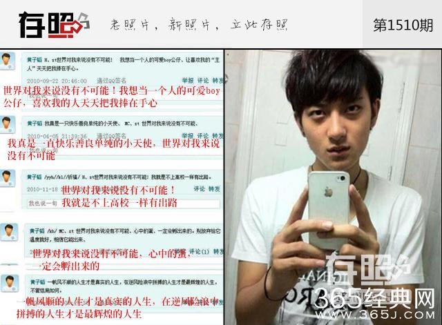 【黄子韬早年qq签名全是励志鸡汤】黄子韬因为耿直的性格,黑到深处自然红,越来越受到粉丝和网友喜爱。据悉,他出生在青岛,虽然从小家庭富裕却十分励志,曾在一家餐饮店打工做服务员,后来机缘巧合参加MBC海选被SM公司相中,签约成为旗下的练习生。早前,有网友曝光了黄子韬早年的qq个性签名,wuli韬韬简直可爱到爆,不仅称自己是一只“快乐善良单纯的小天使”,还希望变成一个人的“可爱boy公仔”。此外,韬韬qq签名经常发一些自我激励的鸡汤文,他每一句话前面必定要加上“世界对我来说没有不可能”几个字,是个十分上进又执着的男孩子。(图左黄子韬qq签名,图右黄子韬早年照片)