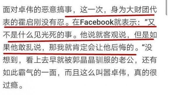 不过作为老公霍启刚可没给卓伟这个面子,平时温文儒雅的形象在发起火来也是挺吓人的,霍启刚昨天就在网上留言:卓伟爆料可以可观的说,要是胡说八道就要他后悔。