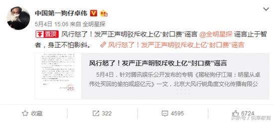 还记得卓伟在应对风行工作室摄影师集体辞职时说的话吗?“工作室一切正常,我很好,还有料”是不是这句?可能吃瓜群众还在奇怪,一向自诩说到做到雷厉风行的卓大大这是患了健忘症还是怎么了,说过的话过了几天也不见声音图像?原来,卓伟手里确实有料,不过还没等到把这些料爆出来,已经被正主提前闻到风声,花8000万封口费给买走了!
