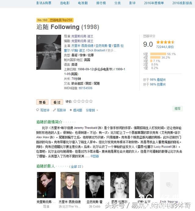 这部最早的诺兰的电影,并没有看过,虽然豆瓣给出了9.0的高分,因为年代比较远,资源比较难找,又是他早期的作品,知道就可以了。