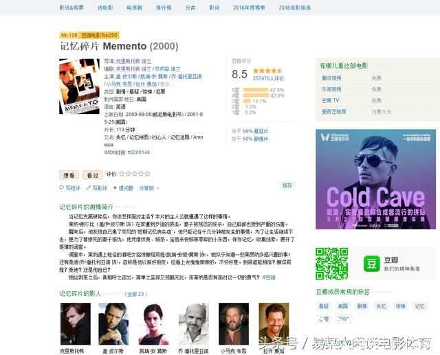 这部应该算是诺兰的成名之作了,人物不多,用了打乱时间顺序的剪辑手法,看起来很酷,非常烧脑,但是评论比较两极,有的影迷说是神作,看豆瓣评分8.5,就可以感觉的出来,但也有一部分人说并不好看,因为看第一遍根本看不明白。