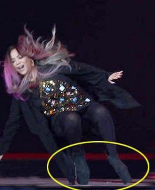 国内敢于挑战LadyGaga同样高度的明星,恐怕非阿妹莫属了。据悉,张惠妹演唱会或是平时活动,都特别喜欢踩恨天高。不过也有“驴失前蹄”的时候,踩恨天高在演唱会上边唱边跳,后果就是稍有不慎就摔跤。