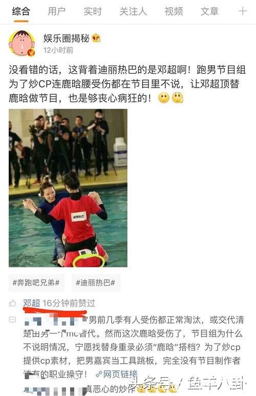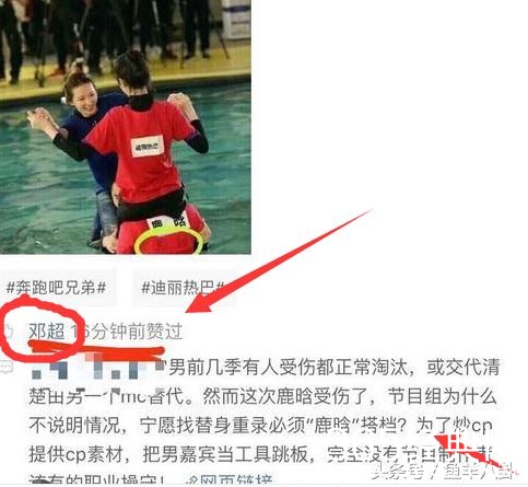 邓超竟然点赞了一条微博,认定两人是炒作!邓超还说,鹿晗腰伤,节目组找了替身,非要凑成是鹿晗和迪丽热巴,剪辑出什么粉红。
