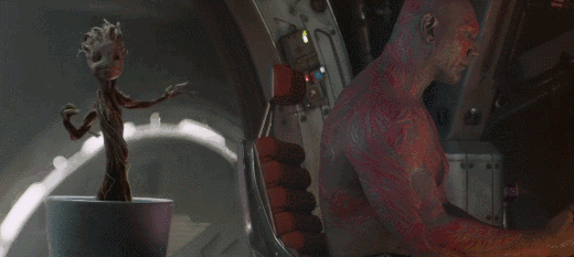 有一次德拉克斯被摔在地上,当他盯着格鲁特宝宝时,格鲁特宝宝便一动不动,仿佛在玩123木头人的游戏,和第一部彩蛋中的情形一模一样,大概格鲁特宝宝觉得被这个凶神恶煞的大块头盯着时一动不动才是安全的吧。