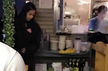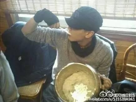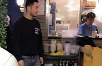 生完小海绵一段时间后,有网友在路边小吃店拍到黄晓明和baby吃小吃,小两口穿着黑色情侣装,Baby的发型随意自然,两人一前一后。