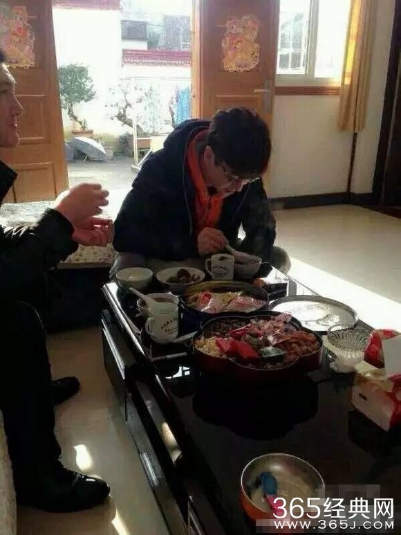 全家人围坐在一起吃饭,穿着厚棉袄,浓浓的家的味道。