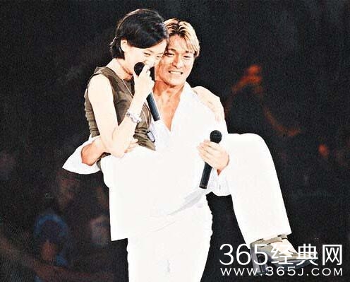 刘德华怀中抱着的是梅艳芳,你可注意到梅艳芳一脸娇羞,据说当年她是暗恋刘德华的,被梦中情人当众公主抱,真是一件非常幸福的事情。可惜的是,她带着无数人的思念早已魂归天国,一生都没有披上过婚纱。
