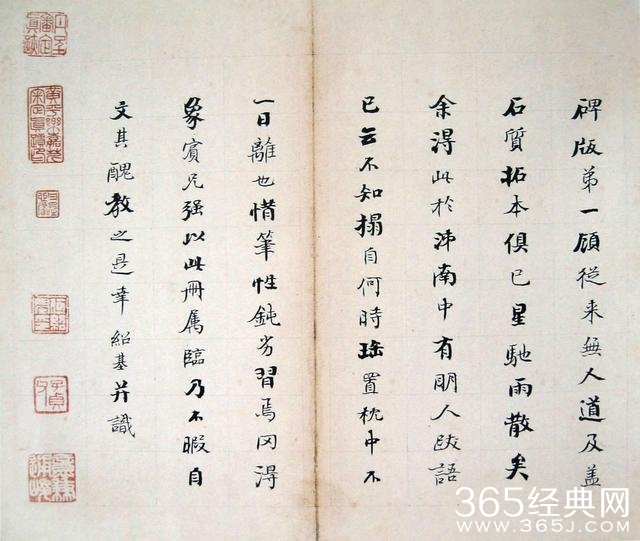 【释文】:魏故南阳张府君墓粁……(文略)遐风永迈,式铭幽传; 张黑女铭,精整古浑,为元魏碑版弟一。顾从来无道及,盖石质、拓本俱已星驰雨散矣。余得此於烃南,中有朋人跋语,已云不知莪自何时。航置枕中,不一日离也。惜笔性钝劣,习焉冈得。象宾兄强以此册属临,乃不暇自文其丑,教之是幸,绍基并识。