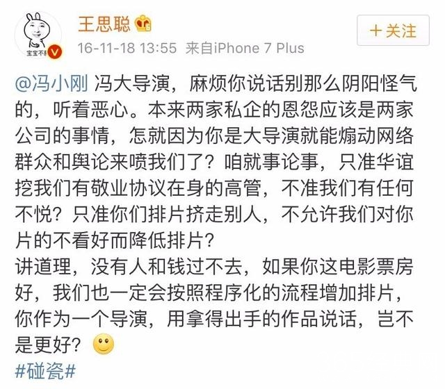 而冯导思聪因为《我不是潘金莲》的低排片开撕时,就有人提出质疑,万达院线作为一家上市公司,给这样一部片子低排片是否符合股东的利益值得商榷。华谊兄弟的官方声明也指出了这一点:“作为上市公司做出的决定应该是以保护和尊重投资人为第一前提。”