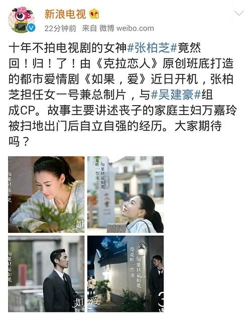 近日有消息称,张柏芝将与吴建豪,与《克拉恋人》原创班底打造一部都市爱情剧《如果,爱》。张柏芝出演女一号,还是总制片人。这部戏讲述了丧子家庭主妇万嘉玲被扫地出门后自立自强的经历,宛如翻版《回家的诱惑》。