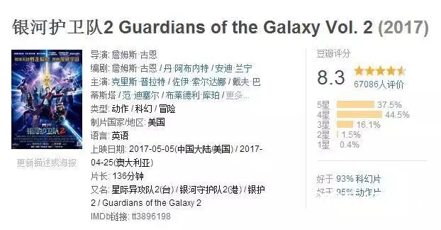 时隔三年,漫威最逗比的一群英雄要再次拯救宇宙了。4月底,《银河护卫队2》已率先在中美以外的37个市场开画,首个周末凭1.012亿美元轻松登顶全球周末票房。5月初,国内上映一周,豆瓣评分也达到8.3分,甚至超过了第一部。