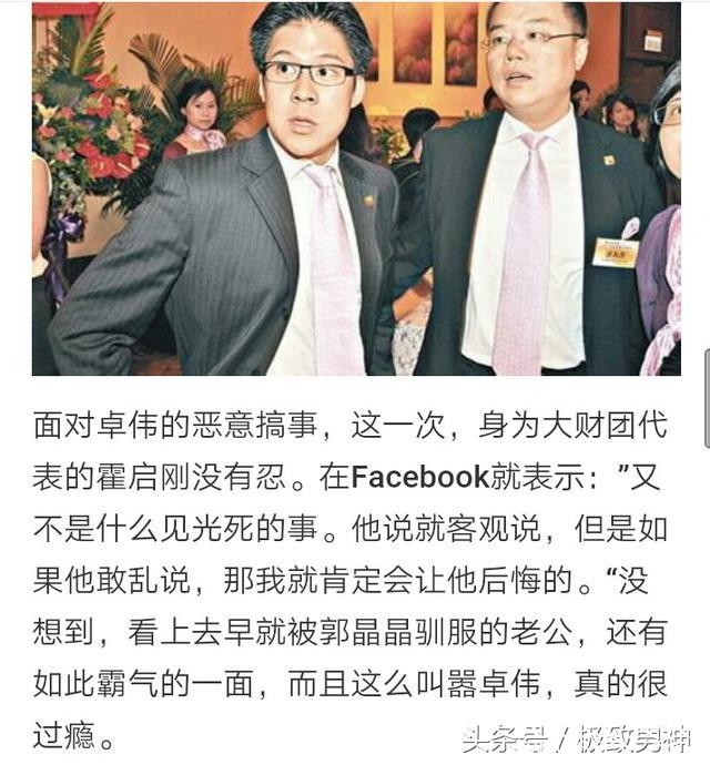 可惜卓伟这次踢到铁板了!郭晶晶老公霍启刚对此零容忍,并在Facebook上发文,说这也不是什么见不得光的事情,他说就客观的说,如果敢乱说,那我就肯定让他后悔的。作为大财团接班人的霍启刚难得的正面反击,非常男人的维护了自己的妻子,实在过瘾。