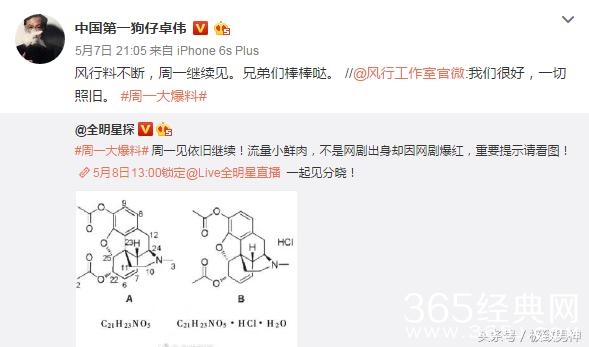 5月7日,中国第一狗仔卓伟在微博称#周一见#,将爆料流量级小鲜肉吸毒,配上一张海洛因的分解式子,声称这答案提示,并指出该鲜肉靠网剧走红,根据他的爆料直指张一山,张一山无辜躺枪。