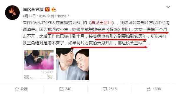 结果陈铭章导演在微博上直接否认了6月开拍的可能性,因为焦俊艳的档期已经排到10月份,陈铭章自己现在在休假,休假结束就要投入到另一部剧的拍摄中,可能无暇顾及《再见王沥川》的拍摄。