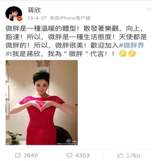 人红了话题也就多了,缠绕她最多的就是她的身材了,很多人呼她蒋大壮,她从开始的接受到后来的“大战”减肥。悔改还是好的。然而随后的每年里,蒋欣忽胖忽瘦,但是减肥一直在她生活中没有停止。