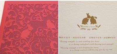 还有赵又廷和高圆圆的喜帖,封面是喜庆的大红色镂空花纹加上两人的英文名MARK和YUAN,内页简单的写着:“诚挚邀请您一同来分享我们的喜悦。”