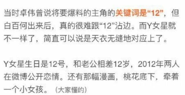 就在爆料之前,卓伟曾提前预告此料关键词为“12”。而扒手推测白百何和“12”根本没有任何的联系,所以说卓伟要爆料料的不一定是白百何,原主角被公关,白百何就变成了替罪羊。