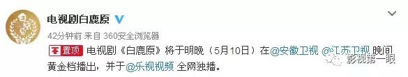 就在刚刚,电视剧《白鹿原》官方微博发文表示:5月10日晚,安徽卫视、江苏卫视黄金时间档播出,乐视网独家播出。。。
