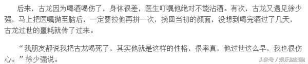 古龙的最后一年,最爱的是找徐少强喝酒,第一次喝酒时,二人拼酒,结果古龙输了,身体开始抱恙,医生劝其要滴酒不沾。马上,古龙就按耐不住酒瘾,又跑去找徐少强,把医嘱抛至脑后,一定要拉他再拼一次,挽回颜面。