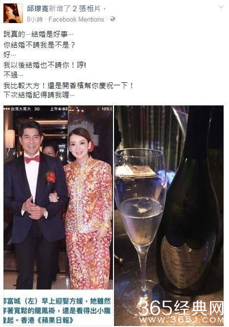 所以,婚礼当天,宽姐在脸书上发文,“你结婚不请我是不是,好,我以后结婚也不请你,哼!不过我比较大方,还是开香槟帮你庆祝一下,下次结婚记得请我!”宽姐的这段话调侃意味明显,却恰到好处地指责了郭富城的不懂人情世故。虽有诅咒这对新人的意思,却因语气风趣幽默,让网友直呼过瘾。