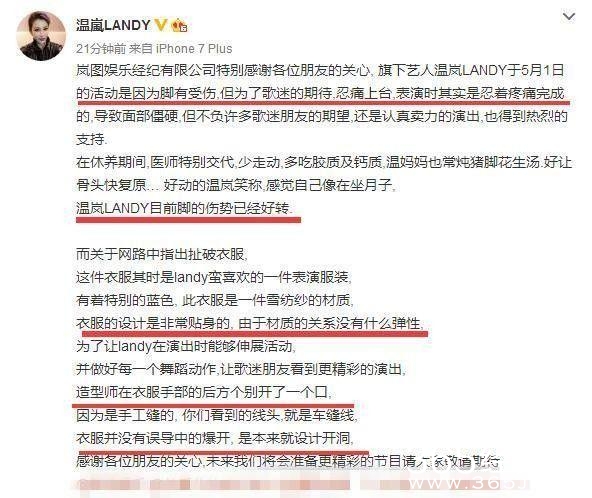 尔后温岚所属的经济公司出来辟谣说并不是整容的后遗症,而是由于脚有受伤,但为了歌迷的等待忍痛上台,演出时实在是忍着痛苦伤心完成的,而导致的面部僵硬。