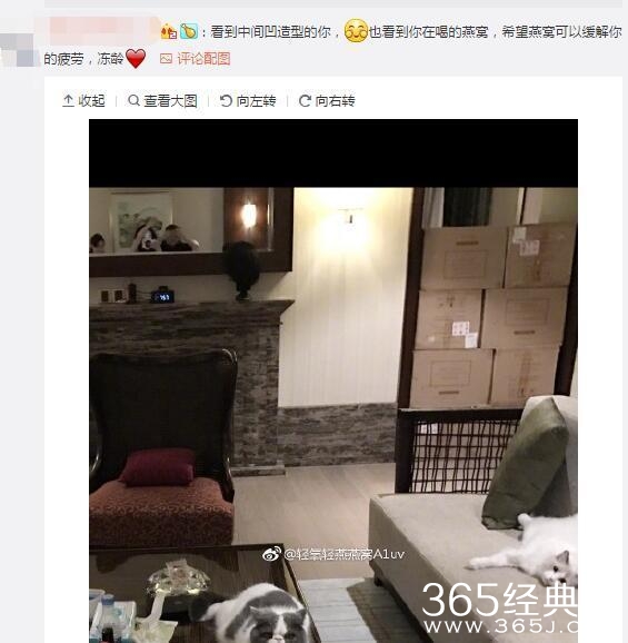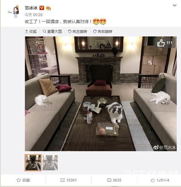 范冰冰说到:收工了,一回酒店,就被认真对待!点开照片,很醒目的就是有三只猫眯,各自霸占自己的地盘,由此可见,范冰冰还是很喜欢她的妈咪的,在外拍戏也得带着它们!