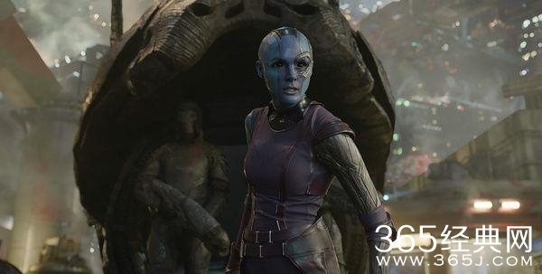 还有卡魔拉的妹妹星云,在影片中星云妹子光头+蓝皮肤+机械手的设定很帅气,不过完全让人看不出饰演星云的演员凯伦·吉兰的真容。