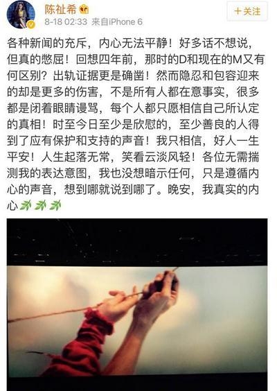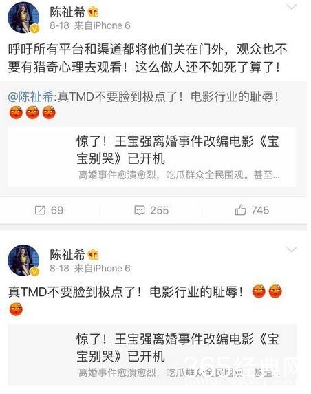 另一件事就是王宝强和马蓉的事件,去年继王宝强自己曝出来以后,很多好友都出来力挺王宝强,陈祉希也是,她在微博上连发两条微博痛斥马蓉事件与当初董洁事件无两样,并强烈要求各大媒体封杀马蓉,话说得虽然比较狠,但是在当时的氛围之下,很多人都站出来支持她。