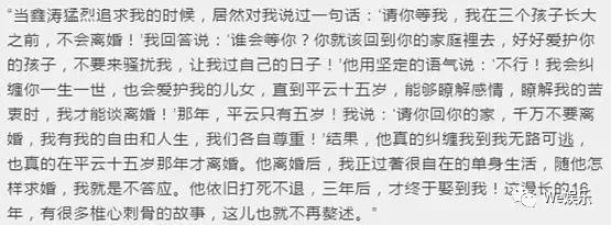 平鑫涛儿子平云的声明如下,提到琼瑶并没有很辛苦地照顾自己爹,琼瑶夸大付出,她有佣人、助理、以及自己的子女;过去50年都是平鑫涛在照顾她。甚至行文中间爆炸性地提到琼瑶当年插足平鑫涛婚姻,“我们从来不曾忘记当年发生过的种种事情以及自己母亲所受到的委屈与痛苦”。▼