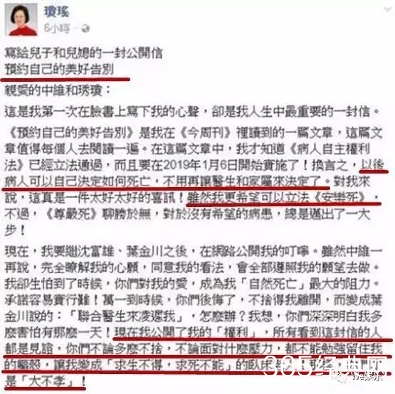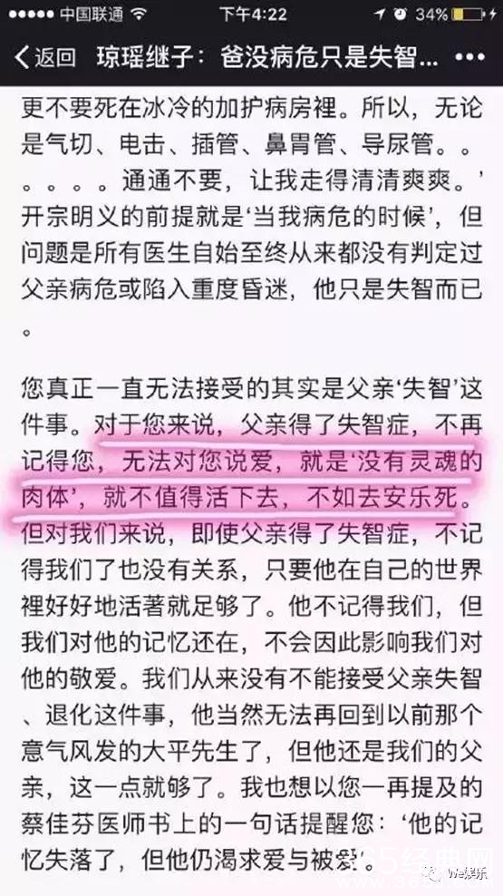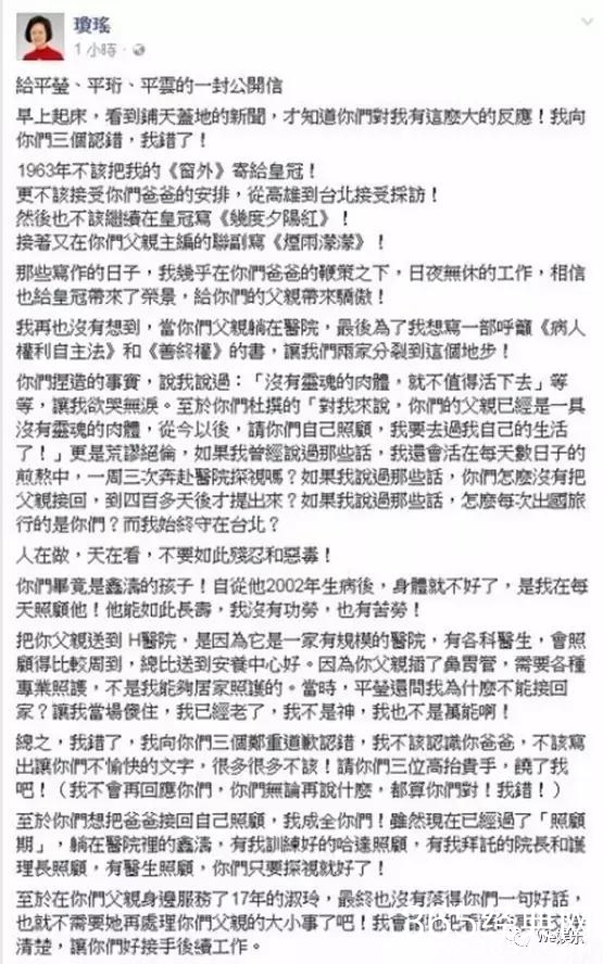 今年三月份,琼瑶突然在脸书上发表了一篇文章《写给儿子和儿媳的一封公开信》,“预约自己的未来”,意思是如果有一天自己在床上动弹不得的话,不要联合医生凌迟我,而要让我安乐死。