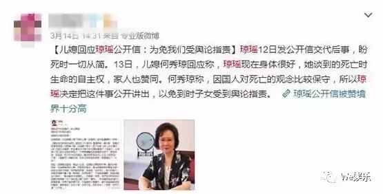 不久琼瑶儿媳何秀琼回应媒体说,琼瑶现在身体状况很好,在这封公开信里谈到的观点其实家人之间早有商议,“自从前些年公公身体变差之后,她就跟我们谈到过,希望到最后时刻能够拥有对于自己生命的自主权,我们也都同意她的意见。不过考虑到中国一直沿袭的对于身体和死亡的观念还比较保守,所以她决定把这件事公开讲出来,以免到时候作为后辈的我们会受到舆论指责”。