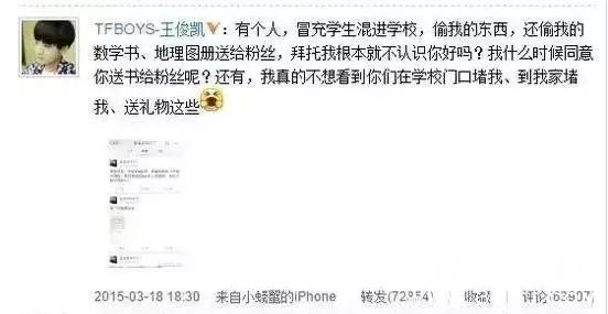 年少成名的王俊凯烦恼也不少,有些“粉丝”冒充学生,到学校偷走了王俊凯的课本,送给其他粉丝