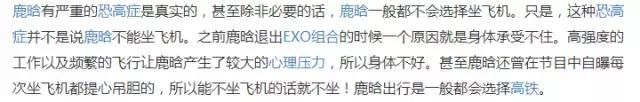 由于鹿晗有严重的恐高症,不能坐飞机,所以出行只能坐高铁