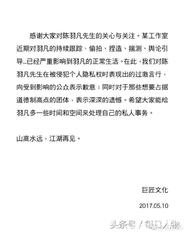 随后,陈羽凡所在的巨匠娱乐发布微博,为陈羽凡的过激言行向公众道歉,但同时也措辞严厉地说:“某工作室近期对羽凡持续跟踪、偷拍、捏造、揣测、舆论引导已严重影响到羽凡的正常生活,希望大家能给他一些时间和空间处理私人事务。”最后还意味深长地配上一句“山高水远,江湖再见”。