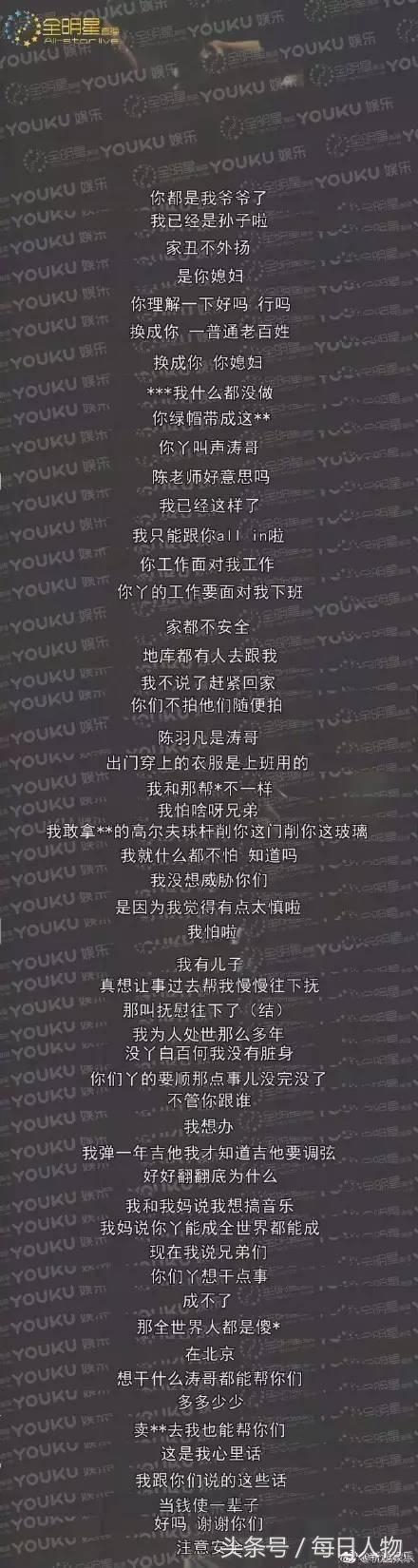 他还对摄影师进行控诉:“我都成这样儿了,我已经all in(疲惫到了极点)了,各位爷…… ”并直言“家丑不可外言”,“没白百合我不会脏身”。陈羽凡还强调了自己的儿子,表示,“真想让事情过去,帮我慢慢抚(慰)”。
