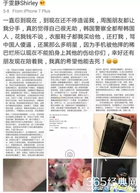 于雯静在微博透露说男票花她的钱,还打她,甚至还把她指甲给掰断了。与其他撕逼的网红一样,这对当然也是闹到了警察局,但因为身在韩国,所以警察局却并没理会他。