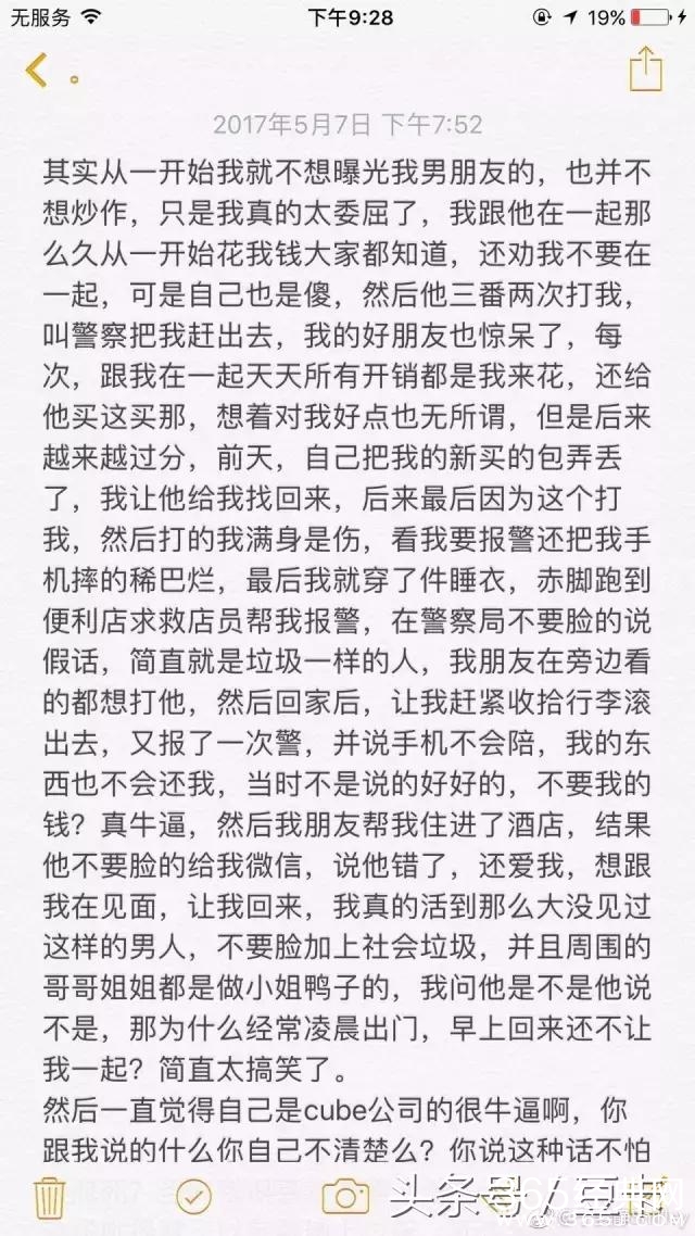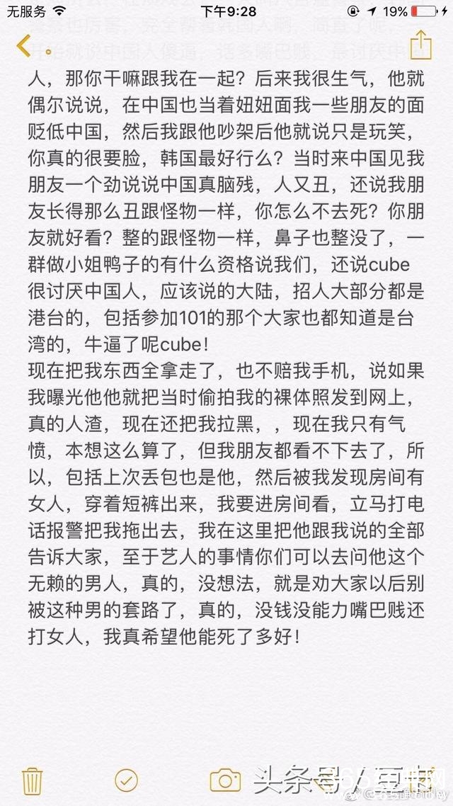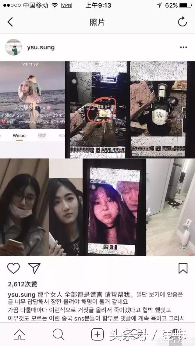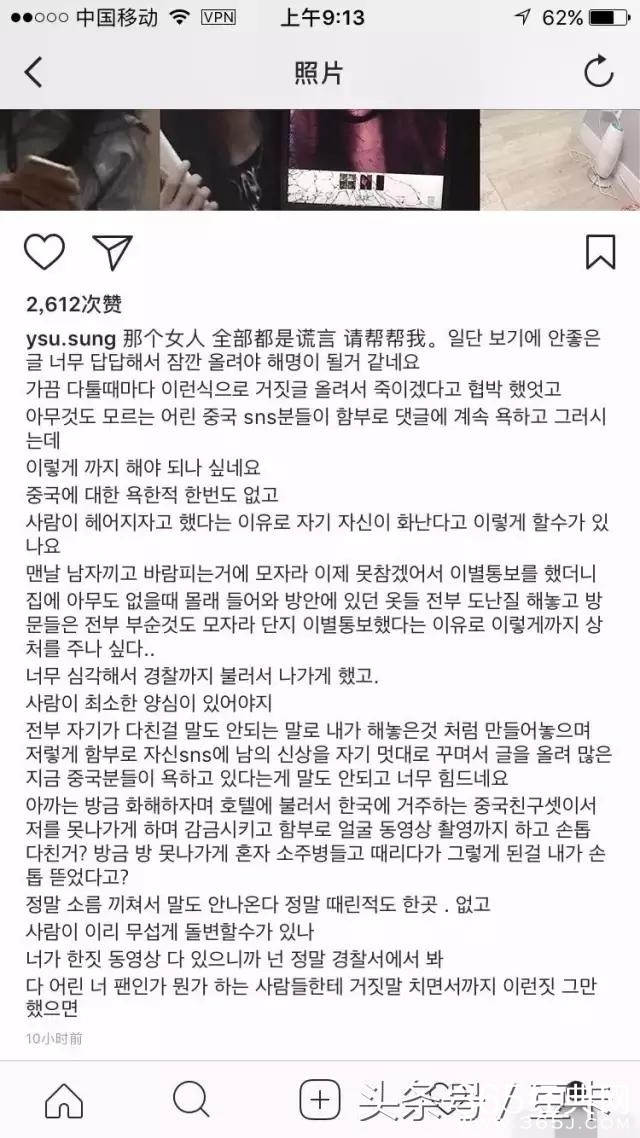 文字大意:偶尔的小争吵为什么要上传这种文字来威胁我,在不明事实真相的中国SNS上传这种文字骂我,真的要做到这种地步么?我从来没有骂过中国,分手的理由也是因为她的个人原因分手的,自己跟不同男人搞外遇不说,还每次在我不知道的时候到我家里把我的衣服什么全部毁掉、偷走,甚至在分手后还要给我带来这样的伤痛。我太伤心了,就叫了警察,人起码要有良心吧。明明都是自己故意搞出来的伤却非要说是我弄出来的,还拍了照片发到SNS上,现在已经有很多人来骂我了,我真的很累。刚刚打过来说要跟我和解,把我叫到酒店,却叫来自己在韩国交的中国朋友,把我堵在酒店不让出去,还打我骂我,随意拍我的脸,还自己用酒瓶打自己,这是我干的吗?真的太害怕你这种人了。