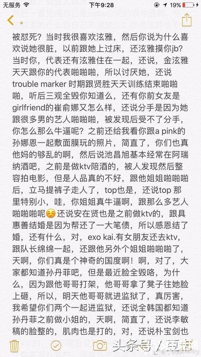 随后她还在微博写下长文曝光一系列所谓“韩国娱乐圈的猛料”,涉及到泫雅、BIGBANG成员TOP、池昌旭、安宰贤、EXO成员KAI等韩国艺人具体你们看下图吧…