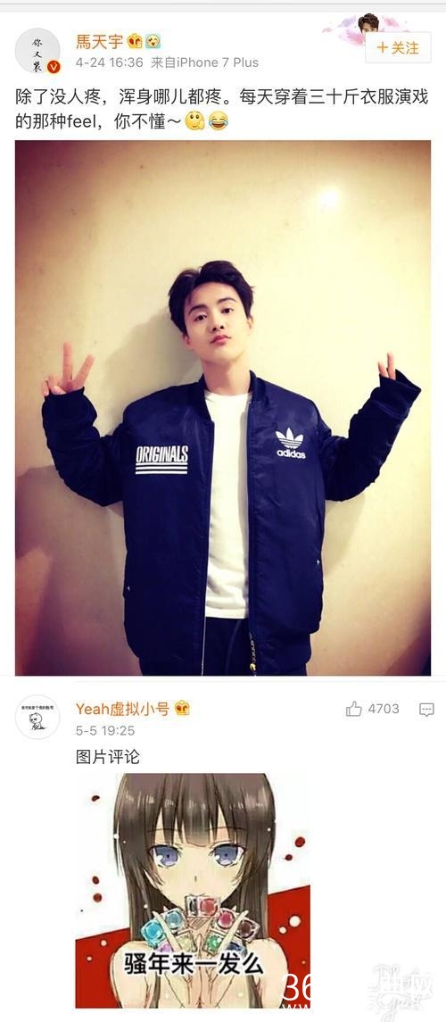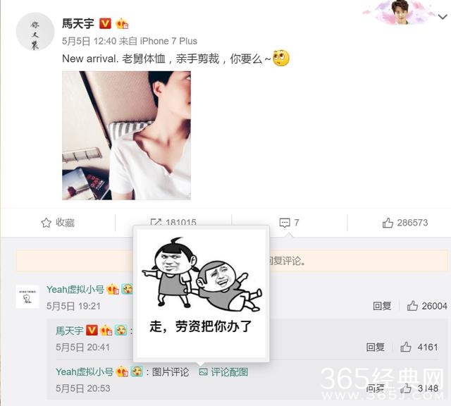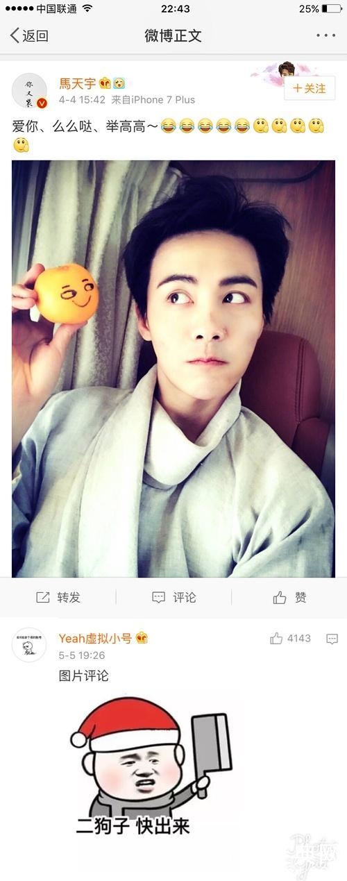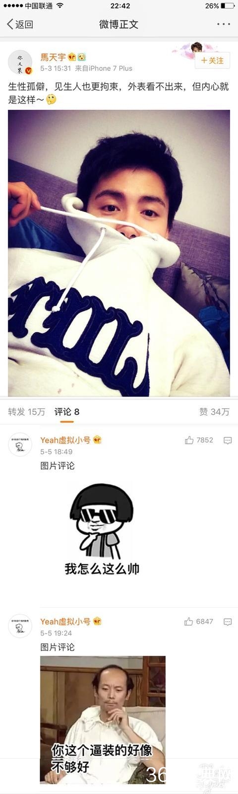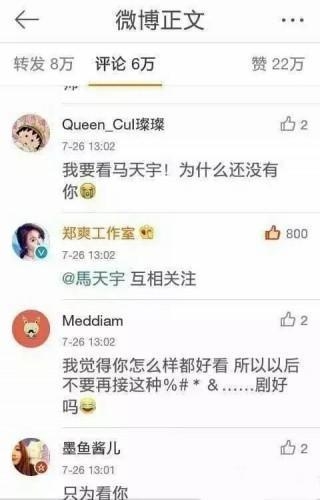 但这都不算啥,zuo翻了马天宇好几条微博,发现近段时间几乎每条微博郑爽的小号都有去评论,而且还都是图片评论,画风也是很符合社会爽姐的气质呢:放飞自我。