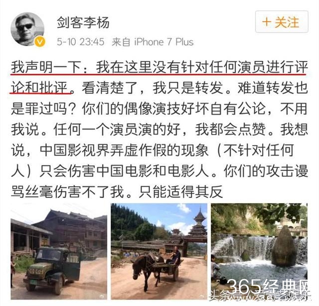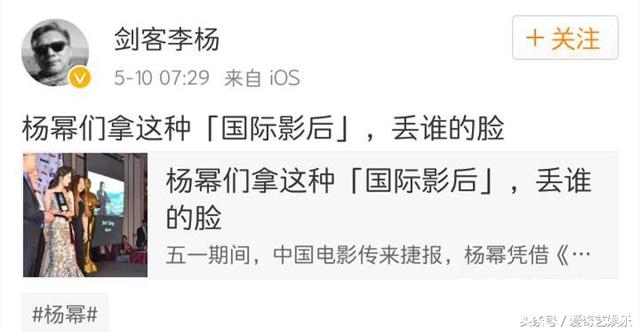 5月10日 导演李杨在微博转发文章《杨幂们拿这种“国际影后”丢谁的脸?》 粉丝炸了...