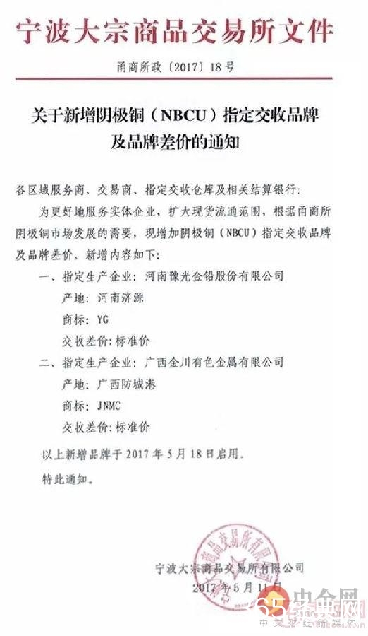 中金社2017年5月12日消息,2017年5月11日宁波大宗商品交易所官网发布关于新增阴极铜(NBCU)指定交收品牌及品牌差价的通知,详情如下: