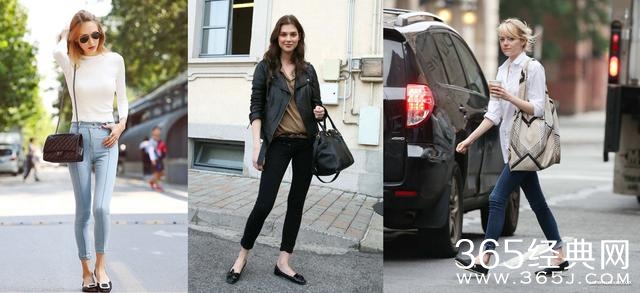 直接选择九分裤,挽起裤脚和露出脚踝是一个很好的修饰腿部比例的方法。