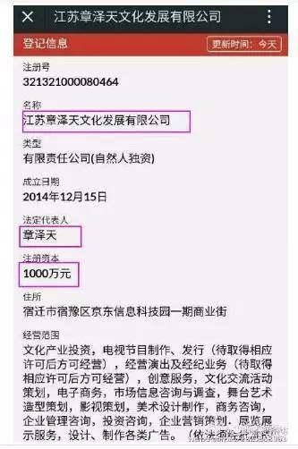 登记信息显示:该公司目前是在业状态,注册资本1000万元,法定代表人和唯一股东均写着章泽天。