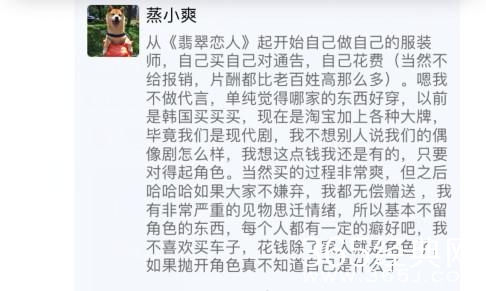 郑爽除了发些搞怪的照片外,还在群中发了一条说说写道: “从《翡翠恋人》起开始自己做自己的服装师,自己买自己对通告,自己花费(当然不给报销,片酬逗比老百姓高那么多)。嗯我不做代言,单纯觉得哪家的东西好穿,以前是韩国买买买,现在是淘宝机上各种大牌,毕竟我们是现代剧,我不想别人说我们的偶像剧怎么样,我想这点钱我还是有的,只要对得起角色。当然买的过程非常爽,但之后哈哈哈如果大家不嫌弃,我都无偿赠送,我有非常严重的见物思迁情绪。所以基本不留角色的东西,每个人都有一定的癖好吧,我不喜欢买车子,花钱除了家人就是角色了,如果抛开角色真的不知道自己是什么了”。