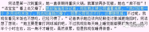 公司一直逼着何洁减肥,何洁自己也在减肥上很上心的原因其实是要通过减肥来转型,好像身材圆圆的,也确实局限于可爱路线。