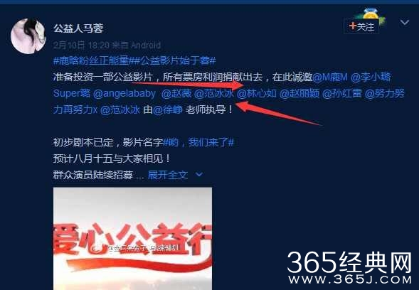 日前,马蓉新的微博号公益人马蓉重回大众视线,艾特赵丽颖、范冰冰、鹿晗等人拍电影。并表示投资所得的分成将全部捐出去。