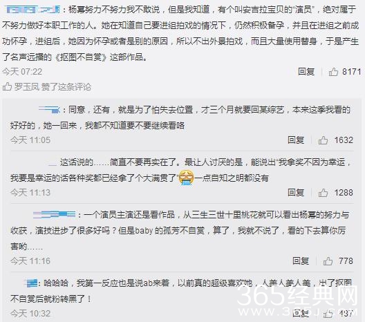 特别是杨颖更遭到了一些网友的“吐槽”,有网友称其不仅演技不好,还属于不努力做好本职工作的人,因为在怀孕的情况下还到剧组拍戏,并且大量使用替身等等。至于凤姐本人,也力挺这位网友的话。